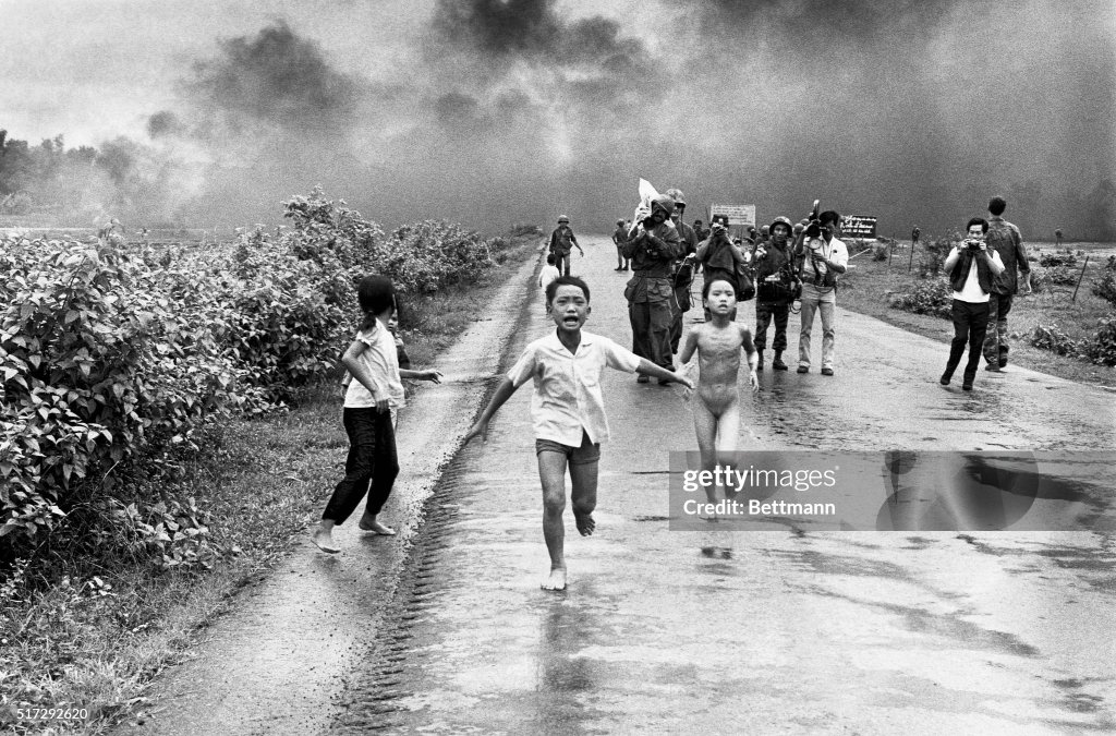 Vietnamese children flee from their homes in the South Vietnamese village of Trang Bang after South Vietnamese planes accidently dropped a napalm bomb on the village, located 26 miles outside of Saigon. Twenty-five years later, the young girl running naked from her village, Phan Thi Kim Phuc, was named UNESCO goodwill ambassador.
